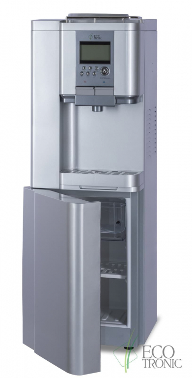 Кулер для дома Ecotronic M3-LFPM с компрессорным охлаждением. Современная панель в VFD с функциями управления. Удобный шкафчик-холодильник на 16 литров. Кнопочный вариант подачи воды. Серебристый. Функция энергосбережения. Температура горячей воды 60 градусов, при подаче мгновенно нагревается до 94 градусов. В верхней части имеется подставка для стаканчиков.